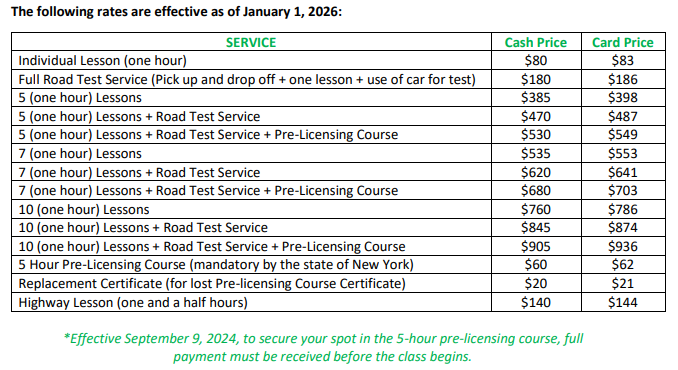 5 Hour Pre-Licensing Course: Required by NYS law prior to taking a road test. Must have a valid NYS picture permit. Call now to register and secure your spot. Please note that full payment must be received before the class begins, effective September 9, 2024.